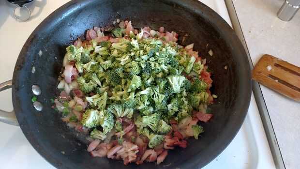 Saltear una taza de tocino a fuego medio hasta que apenas empiece a dorarse. Añadir el brócoli y las cebollas y cocine hasta que las cebollas son claras, el brócoli esté tierno, y el tocino esté crujiente.