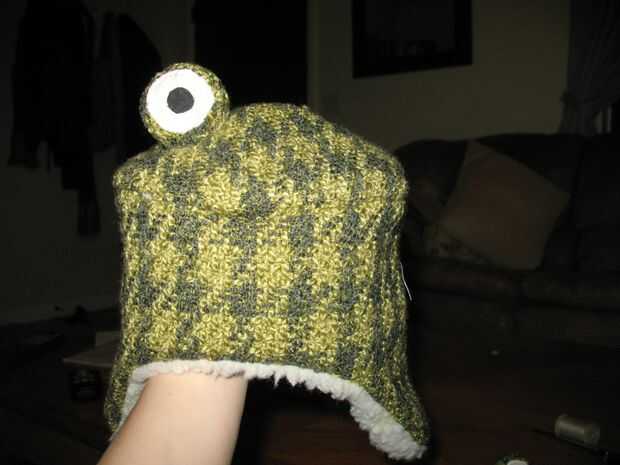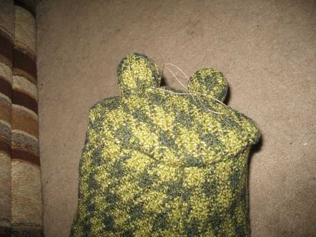 Repita en el otro ojo. Nudo de dentro del sombrero, sacar la aguja entre la capa de forro y exterior alrededor de una pulgada, luego cortar el. Esto atrapará la poca longitud de la rosca queda después anudar apagado entre las capas para que nadie pueda ver.