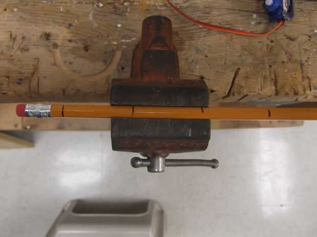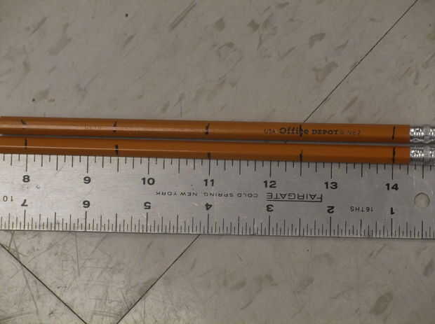 Nuestras clavijas colgantes, usaremos los lápices por una cofia de sierra desde el extremo de la goma de borrar 1'', 2.5'', 4'', 5,5 '' y 7''. Una vez que éstos han sido cortados, debe haber 8 clavijas, 1.5'' largo cada una.