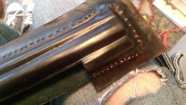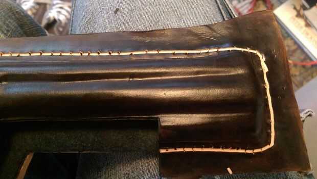 Primero use su lezna de costura (herramienta busca hielo) para hacer los agujeros de costuras hace alrededor del borde entero.