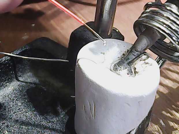 - No necesita fundente. Sólo sostener el cable allí hasta que se ponga plata brillante (puede retirarla y verificar una y otra vez). Puede tomar 20 segundos o menos y el cable podría estar bastante caliente para sostener (use pinzas de punta de aguja si es necesario).