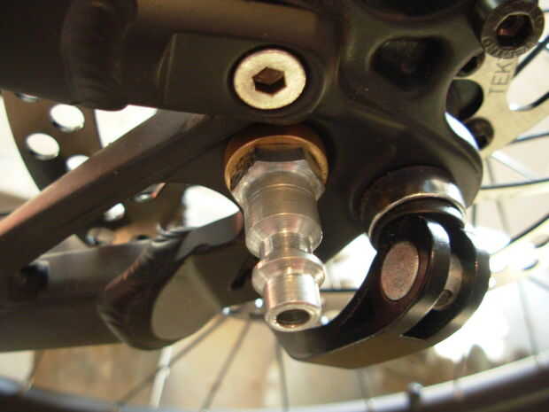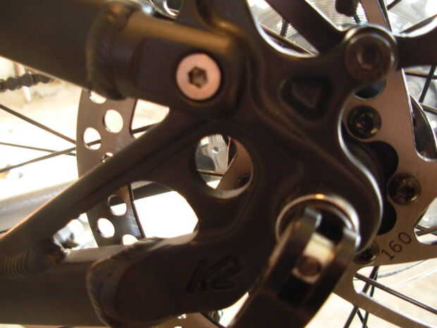 bici de mi esposa no tenía este agujero, así que tuve que cortar el conector y utilice un tornillo de métrica rosca donde asumo la pinza de freno de disco o un soporte de guardabarros empernada encendido. He no todavía probado esto para la fuerza. Pero yo creo que ya aguanté en este conector y llevaría a cabo.