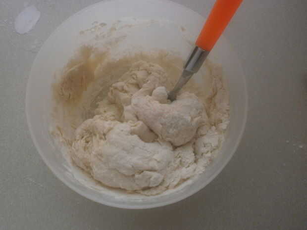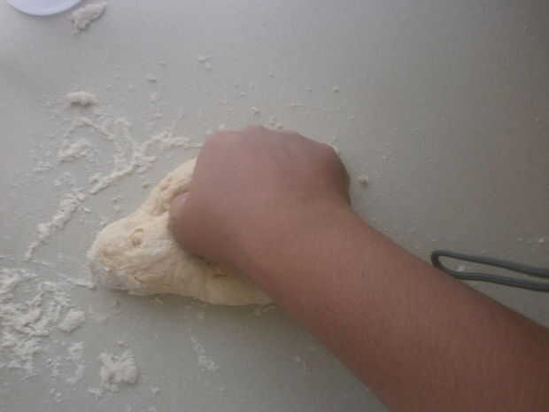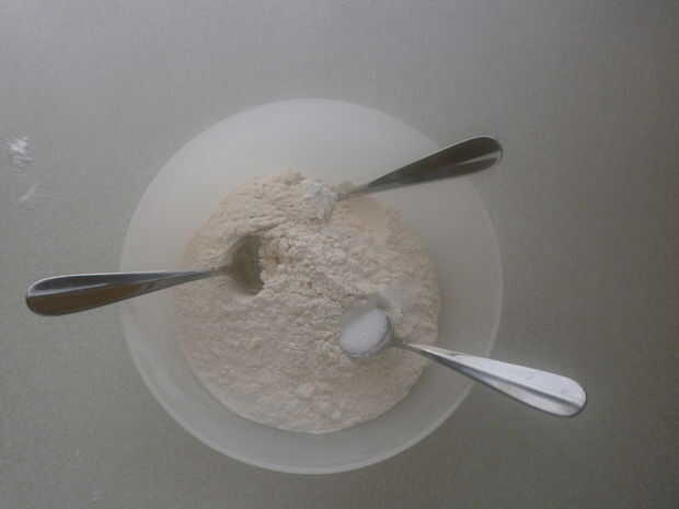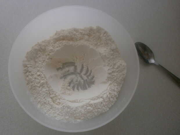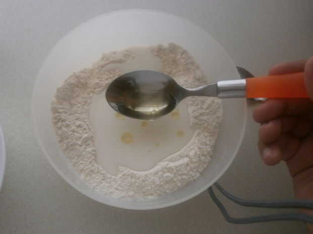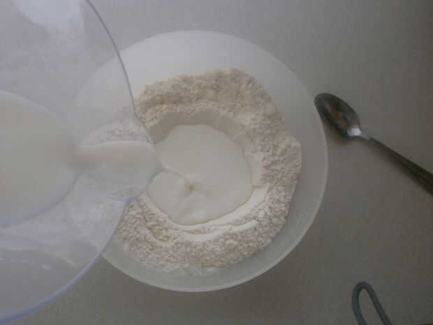 En una mezcla de tamaño mediano cuenco, tamice la harina. Luego añadir los otros ingredientes secos a la harina (azúcar, sal y polvo de hornear). Mezcle bien antes de hacer una pozo en forma en el centro de la taza. Vierta la leche y una cucharada de aceite. En este punto usted parasitósis quieren revolver la mezcla con la cucharada. Puede que necesite añadir más leche o más harina, dependiendo de qué tipo de harina utilizas, así como donde vives (humedad). Generalmente viene juntos fácilmente, cuando esto sucede, que usted está listo para comenzar a amasar la masa. No trabaje excesivamente la masa, debe ser suave y apenas pegue en sus manos cuando esté listo.