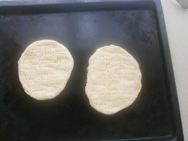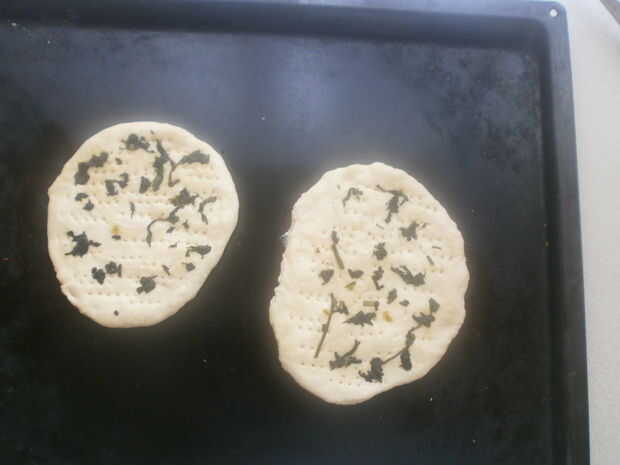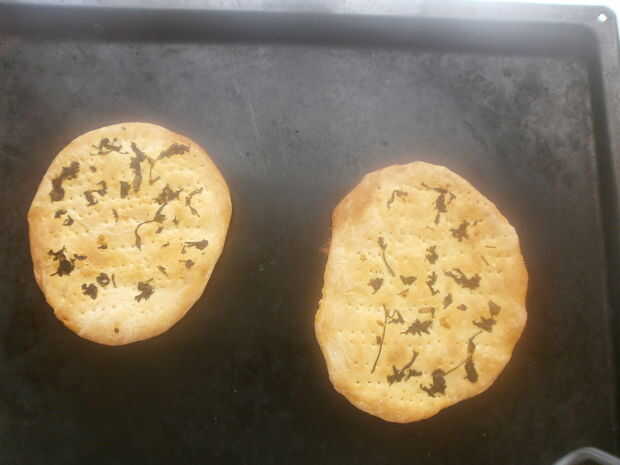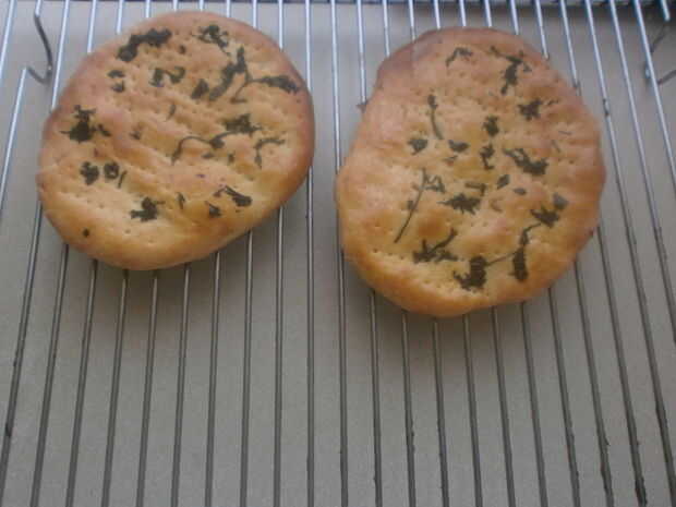 Dividir la masa en 4 o 5 piezas. Como he mencionado anteriormente, hice una receta de media, por lo tanto, sólo hice dos panes. Rodillo del inot piezas formas de bola, ponerlos en una bandeja para hornear y apretar con la palma. Idealmente, deberían ser arount 1 centímetro (1/2 pulgada) de grosor. Utilice la horquilla para empujar los agujeros en los panes, para cocinar más rápido y más uniformemente. ¿Recuerde los ingredientes opcionales? En este momento, es momento de asperjar el EM en tus panes! Espolvorear ajo picado y el cilantro sobre mis panes, antes de presionar firmemente la aromatización en la masa con mi palma. Hornear en horno precalentado hasta que estén doradas, antes de transferir el pan a una rejilla de alambre. Todavía quedan unas gotas de aceite, en este punto se cepilla a los panes para llevar a cabo el color y dar una masa más blanda.