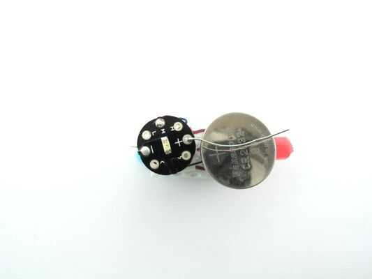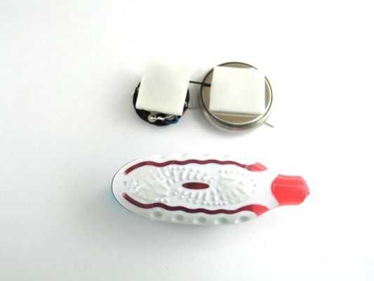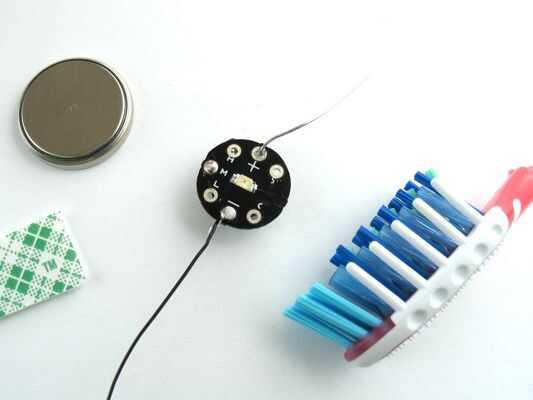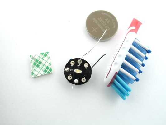 Ahora, fije un fino alambre al - agujero. Al final de la tira y realizar una pequeña bobina que se conecta a la batería-.   Con doble cara adhesiva, fije el sensor de aprendizaje, el motor y la batería a la cabeza de cepillo de dientes.   Doblar el + pin para hacer contacto con la batería.   Experimento con calibración en situaciones claras y oscuras. Calibración ocurre cuando se conecta la C orificio-agujero, como se muestra en el video. Si calibrado en la oscuridad, se ejecuta sólo cuando brille la luz en él. Si, por el contrario está calibrado en la luz, funciona en la oscuridad.