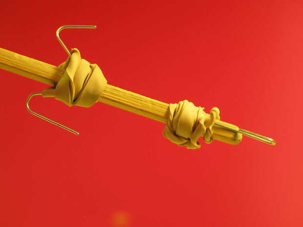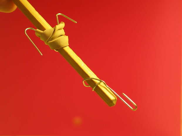 Para fijar el peso gancho al boom utilice otra goma. Sólo envuélvalo sobre las piezas que están tocando los palillos. Hacen de esta banda de goma apretada.