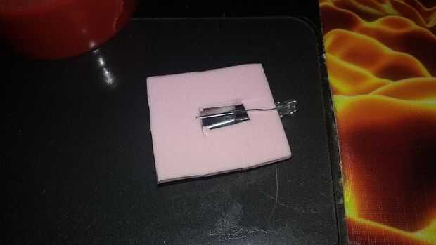 Cortar un cuadrado de 1" de espuma. Cortar un rectángulo de aproximadamente 1/8" por 3/8". no crítico como grande, solo deja una ranura para un ánodo). Ponga la batería en espuma, negativa de espuma. Deslice el LED sobre la espuma y la batería. Cátodo tocando lado Neg de batería y el ánodo sobre la ranura de la espuma. Envuélvalo con cinta. La cinta está en la batería y alrededor de la espuma, para que nada intenta mover. No es necesario ser lo suficientemente apretada como para doblar la espuma. Encontré super apretada envoltura no hace woek, como la espuma no se puede comprimir.