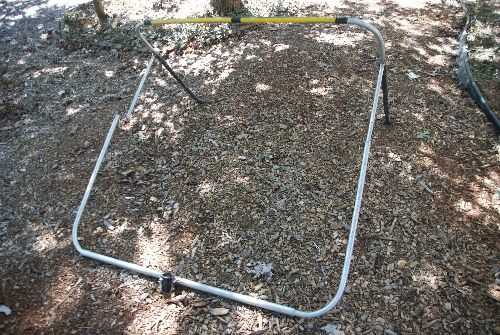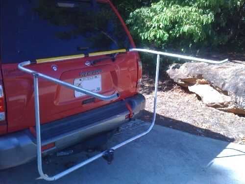 Una pieza de 5/8" manguera de jardín (corte longitudinal) se graba a la parte delantera del tubo portador para cojín donde se sienta el portador contra el SUV. Dos pedazos de llanta de bicicleta se deslizaron sobre los brazos del tubo portador.