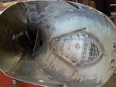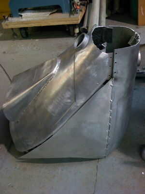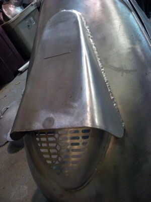 Una vez que había decidido en qué los paneles principales iban a hacerse clientes de, he quitado la pintura y pasó el metal de la rueda que pulimenta para un tiempo de brillar hasta. Si quería llegar tuve que empezar a hacer algunos compromisos, por lo que Paloma en la parte delantera que siento todavía parece un poco "un". Yo ya había montado en la cubierta de la lámpara de calle en la parte delantera, pero necesitan una ventilación para permitir que el aire al radiador. Un calentador de espacio del antiguo dio para arriba su parrilla para este fin. Fin de las dos mitades de la parte delantera para reunirse, tuve que engañar un poco y fabricar paneles de remiendo triangular grande fuera de la hoja de aluminio (no podía todo ser de desecho).