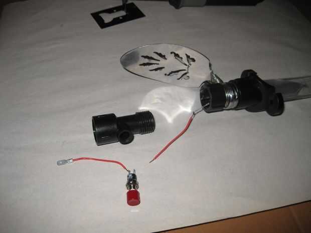 En primer lugar, ejecute ambos conductores de la LED claro mediante el adaptador y tornillo en. de esta manera ni alambre de giros en el proceso. Después de que un poco el gancho y el positivo a través del agujero para el botón de pescado. Soldar el cable del interruptor y mientras estás en suelde el cable en el otro extremo. Engarzado en el rápido se conecta, he usado los varones en el abierto el interruptor y la negativa de lo LED. El positivo de alimentación a través del agujero y fuera de la base y luego presione el botón en su lugar. Si tienes el cable, bueno, podría no volver como fácil pero cuando vas a atornillar las mitades juntas tiene más espacio para la flexión y no romper.