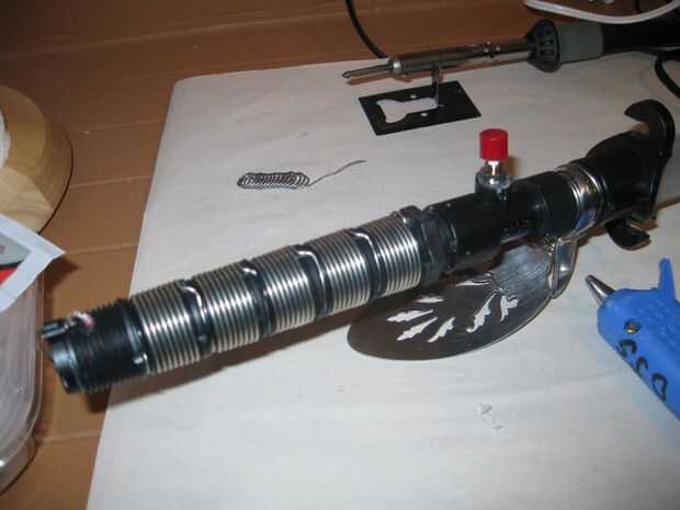 Una vez todo junto y sigue trabajando, seguir adelante y tomar otra vez el pegamento caliente. Fije el soporte de la batería a la base de la manija y asegúrese que el botón esté seguro. Usted puede tomar un razer y recortar el exceso una vez su fresco.