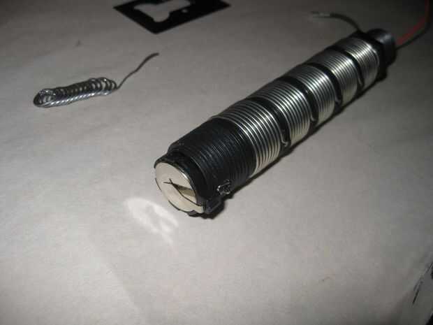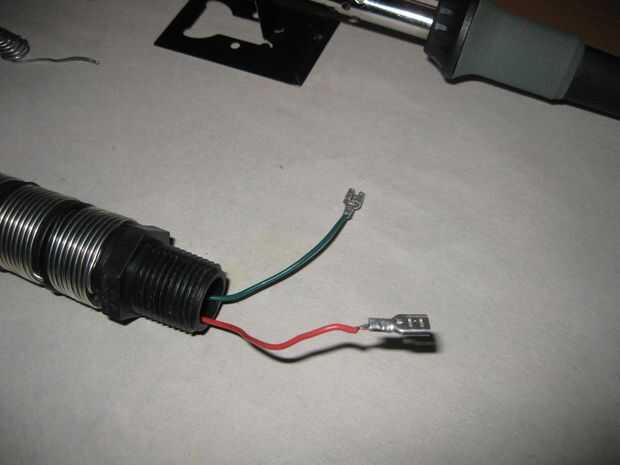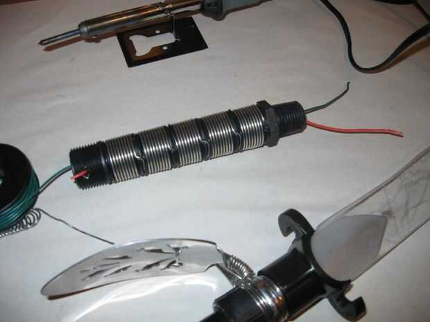 Ahora que la mitad superior está lista para ir permite retomar la manija. Descubrí por casualidad que el portapilas 2025 encaja casi perfectamente en la parte inferior del aspersor 3/4 de pulgada. El positivo es en el exterior pero taladrado rápido soluciona eso. Soldar los cables en el soporte de batería y alimentarlos a través de. La negativa sólo va directamente hasta la manija, lo positivo es insertado a través del orificio en el lado y entonces sigue el juego. Engarzado en la hembra rápida conecta y listo.