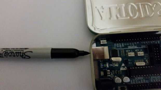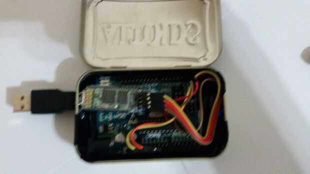 Tomar el altoids y poner el arduino en sin la energía que lo atraviesa. Hacer un punto donde la lata altoids será perforar o cortar el cable conectar al arduino. Perforar o cortar esa parte. Aísle el interior con cinta aisladora sin cubrir el agujero. Coloque el arduino dentro y pegamento o cinta adhesiva hacia abajo, si quieres. Coloque el módulo bluetooth dentro y cierre para arriba. Ahora puedes decorar el exterior o mantenerlo como es. Seguí mío cómo es porque puedo guardar el adaptador dentro de la lata por lo que parece normal cuando no esté en uso.