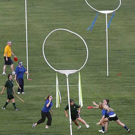 Las áreas objetivo deba ser similar a un gran semicírculo en cada extremo de la cancha. El guardián no puede ir fuera del área y los cazadores no pueden entrar. Dentro de estas áreas objetivo son tres objetivos en forma de aro, cerca del final del campo. Para esta versión basada en tierra, recomiendo hacer el aro del centro a unos 10 pies de alto y y lo dos y cada lado cerca de 6 pies de alto. He incluido algunas fotos de los objetivos para que puedas obtener una idea de unas maneras de armar los aros de gol (aunque en uno juegan con discos voladores)