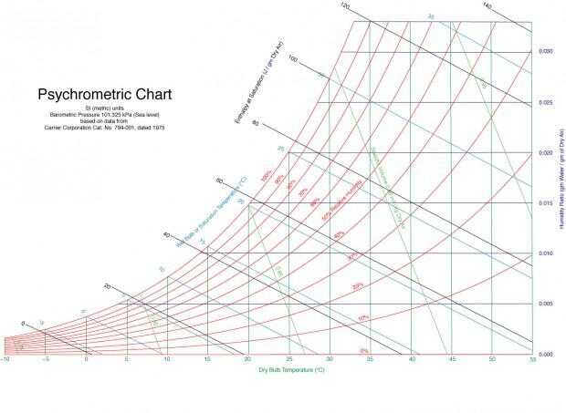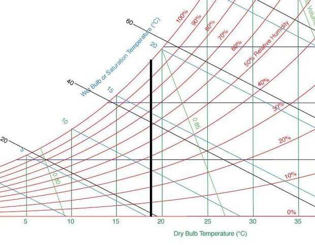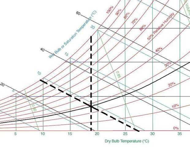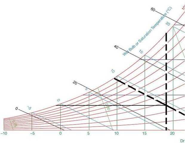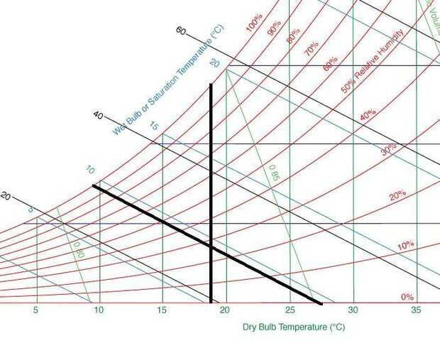 en otra ventana si ya no tienes. Podría ser una buena idea imprimir porque usted se está haciendo referencia a lo menudo.2. ver imagen dos - el eje inferior del gráfico representa la temperatura de bulbo seco. Hay varias temperaturas registradas en el eje. Las líneas de luz verdes que se extiende desde este eje son las líneas de dirección. Encontrar la temperatura de bulbo seco registrado en grados Celsius y trazar una línea recta a través de la gráfica, paralela a las líneas de orientación. Esto es ilustrado por la línea negra he dibujado para mi temperatura de bulbo seco de 18,33 grados en imagen dos.3. Consulte la imagen 3 - la parte superior cóncava línea del gráfico representa el eje de temperatura de bulbo húmedo. Las líneas de orientación para la temperatura de bulbo húmedo son en ángulo y están marcadas en el gráfico en la escritura azul de bebé. Encontrar la temperatura de bulbo húmedo en el eje del bulbo húmedo y trace una línea paralela a las líneas de dirección de bulbo húmedo, similares a lo que hiciste en el paso uno. Como se ve en la tercera imagen, he añadido mi línea de temperatura de bulbo húmedo a la temperatura de bulbo seco.4. ver imagen cuatro - las líneas son de color marrón en el gráfico se etiquetan como "Humedad relativa". Bajan el mapa en forma cóncava similar al eje de la temperatura de bulbo húmedo. Yo he marcado estas marcadas en la cuarta foto. Es necesario trazar una "línea de humedad" de curvatura similar a partir de su intersección de bulbo seco y húmedo y terminando en los puntos de marcada humedad relativa. lo he hecho para mis puntos en la cuarta foto.