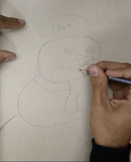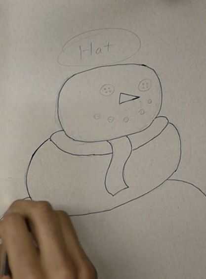 Cuando yo era feliz con mis líneas de tinta, volví y borra las líneas del lápiz y bosquejo callejeros marcas, así como las partes que no tiene intención de transferencia (ojos de botón y marcador de posición de "sombrero"). Salí hacia fuera sombrero del muñeco de nieve porque encontré imágenes prediseñadas me gustó en imágenes de google, que edité junto con mi dibujo - explica a continuación.