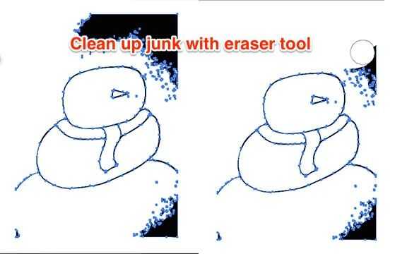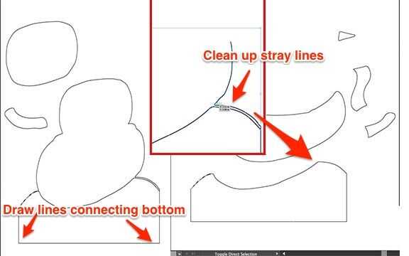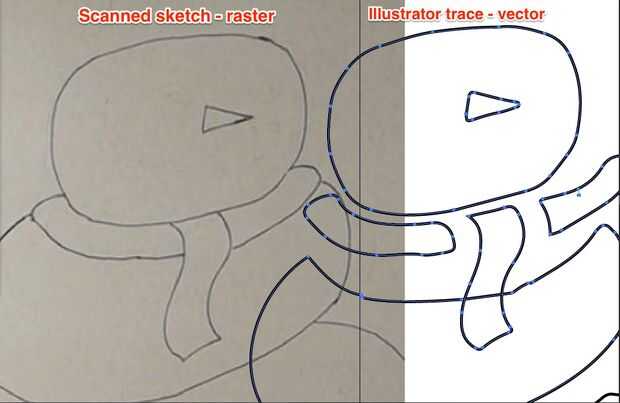 Mis dos primeras fotos en este paso muestran la diferencia entre imágenes vectoriales y de trama. Para los efectos de mi corte por láser, la diferencia importante es que las líneas de vector pueden ser reconocidas por el láser como caminos para recortar formas y formas pueden ser individualmente seleccionadas y editadas (la cabeza, la bufanda, la nariz, etc...). Con mi boceto, el laser no puede diferenciar entre el fondo y mi dibujo, y no puedo editar los componentes individuales. (Información raster vs vector imágenes.)