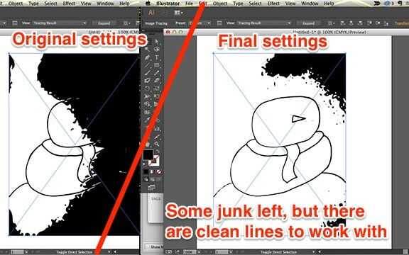 Illustrator tiene una herramienta muy útil llamada "live trace" que permite convertir casi cualquier imagen de trama en un vector de la imagen rápida y fácil. Tengo un tutorial en fotos explicando cómo traduje mi dibujo en líneas vectoriales.