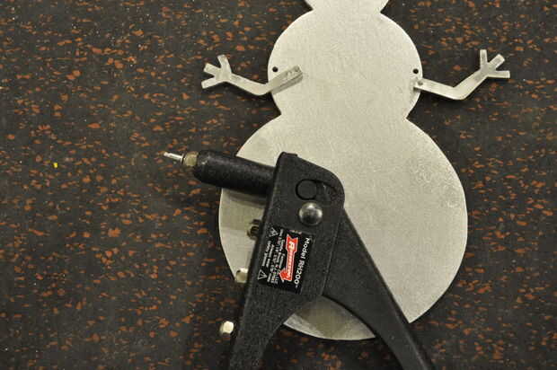 Introducir un remache a través del agujero en el brazo y meter el sobrante del remache en el agujero en el cuerpo.