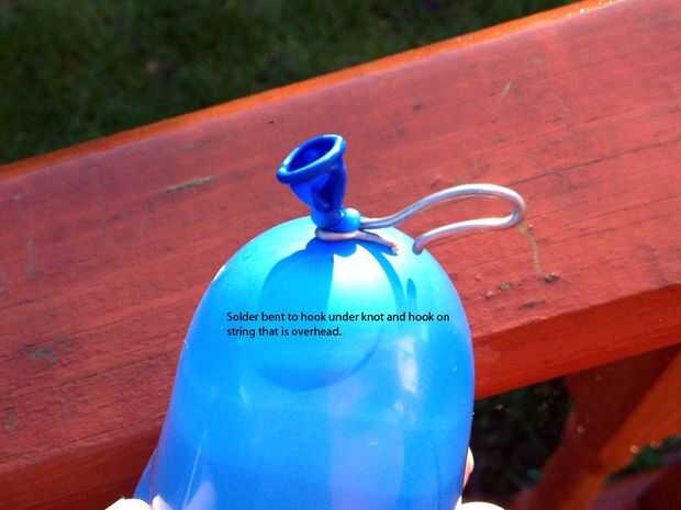 Utilicé globos de agua pequeños, até una cuerda entre los postes de la línea de lavado pero estoy seguro de que algo puede aparejar. Para hacer rápido y fácil montaje de los globos de que utilicé una pulgada la soldadura, doble firmemente bajo el nudo y forma un gancho con el otro extremo, su rápida y fácil de colgar para arriba y pueden usar la misma broca y otra vez...