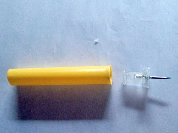 He incluido un tiro de las piezas que utilicé para el dardo, una tachuela de la prensa y la longitud de pajas de plástico jumbo.
