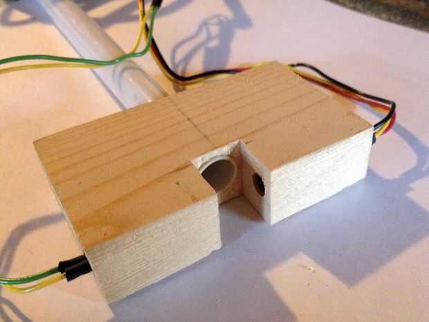 Los tamaños son lo que adapta el tubo y lo que tienes a la mano, ya he decidido que sería más a prueba de luz ambiente si no corte la muesca. El tubo de soplado se insertaría a la misma profundidad como en este diseño, esto ayudaría a los diodos de la foto totalmente incluido en la caja.