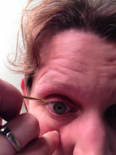 Carga un pequeño, limpiar el pincel con una pequeña cantidad de adhesivo de pestañas y "pintar" una tira fina de pegamento en la parte superior de la pestaña natural la llamarada se descansa en la cima.