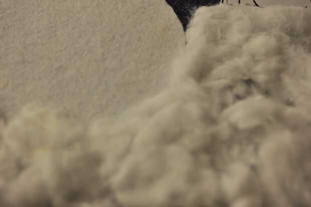 Para la nieve decidimos que bolas de algodón harían el truco y comenzaron a desmenuzar con los dedos para crear algún polvo artificial. Utilizamos el pegamento del aerosol muy cuidadosamente a juntar todas estas partes, aprender de los errores anteriores de fieltro que resultaría demasiado adhesivo en aerosol en cuadros amarillos. Pulverizar el adhesivo bajo la nieve de algodón ayudó a mantener todo juntos y hace una decoración maravillosa mesa para celebrar la llegada del invierno.