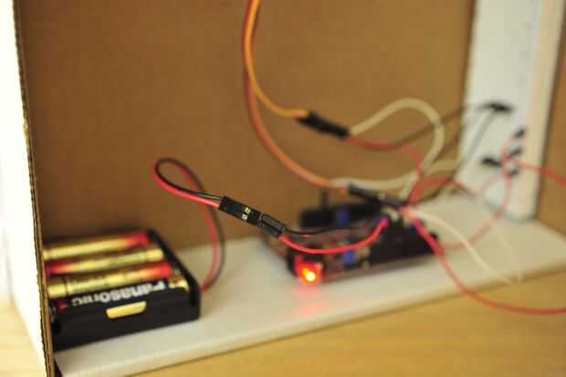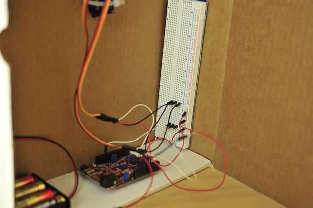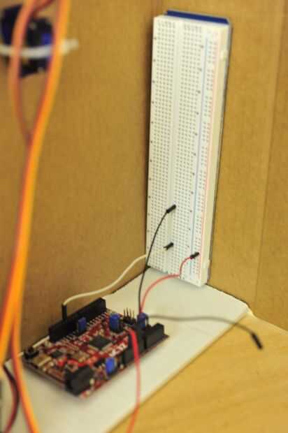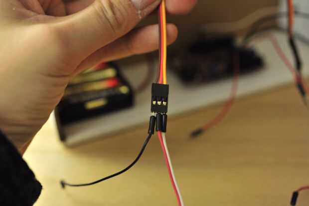 Los cables de servo tendrá entonces que ser enchufado en la misma fila o columna que elegiste para los cables uC32 rojo, blanco y negro. Si usted utiliza los cables de jumper color mismo que mostramos en la imagen 2, entonces este paso consistirá en coincidencia de colores de los cables. Los cables de puente blanco y negro conectados a cada servo se deben insertar en la misma fila que los cables uC32, debajo de una rúbrica de letra diferente. Por ejemplo, el alambre de puente negro uC32 es en fila 20A a nuestra imagen, y los dos cables de servo negro están conectados a 20C y 20E. Como coincide con el número de fila, usted va a estar bien elegir cualquiera de las letras como su enchufe en lugar.