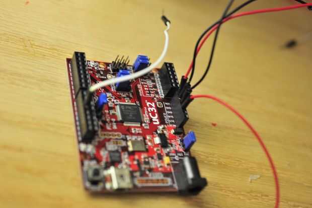 Ahora que el código es cargado en el microcontrolador, puede comenzar a conectar los cables de puente a sus tablas. Comencemos por fijar los dos rojos y dos cables negros a su uC32 a lo largo del cabezal de alimentación. Los dos cables rojos va a ser conectados en las clavijas de VIN y 5VO. Luego se unirá a los dos cables negros en los pines GND entre los cables rojos. A continuación, enchufe el cable de puente blanco en el pin 11 de la cabecera DIGITAL PMW frente a los otros cables (ver imagen 1).