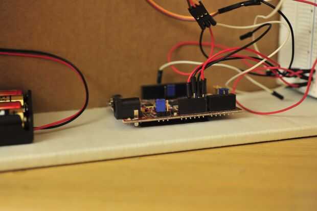 Sólo necesitamos conectar tres de nuestros cables de nuestros uC32 en la placa, dejando un juego de negro y rojo para la fuente de alimentación. El primer cable rojo que está conectado en el pin VIN en su uC32 puede insertarse en cualquier pin a lo largo de la línea roja de nuestra placa. El cable negro al lado de nuestro cable de VIN rojo luego puede insertarse en cualquier fila de pin definido por los valores ABCDE. El cable blanco entonces modelo el cable negro, donde puede insertar el cable en otra fila (diferente a su fila de alambre negro). Imagen 3 más demuestra claramente esta idea.
