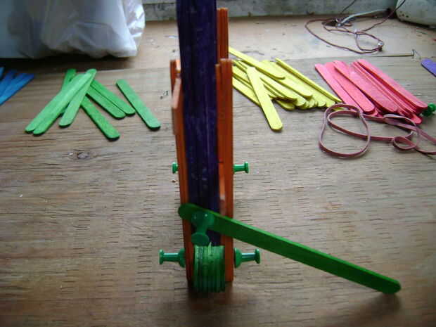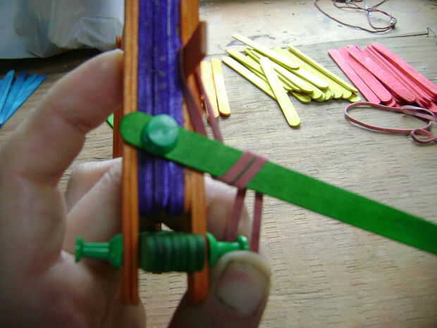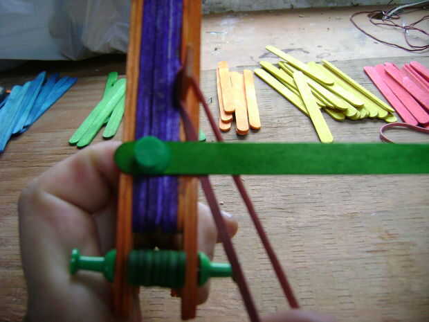 A continuación, vamos a utilizar una banda elástica para sostener el palillo así que a no soltar el palo y cae el soporte de todo. Puede ser una manera mejor de hacer esto y si sabes cómo hacerlo. Puedes ver en las fotos cómo herí a la banda de goma (pero asegúrese de que se estira). Crea bastante fricción y tensión para mantener el soporte en la posición en que desee. Moviendo la palanca hacia arriba y hacia abajo ajusta el ángulo en el cual se inclina el soporte y el brazo es bastante rígido.