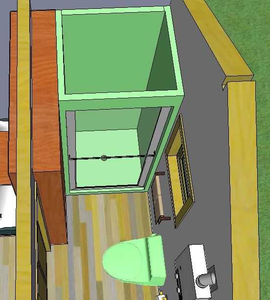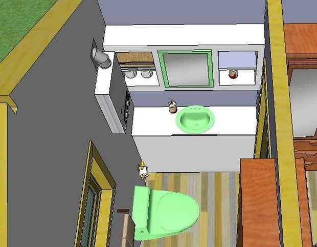 Cuadro 6 muestra el lavabo del baño, gabinetes de pared y tocador. Para uso fuera de la red, recomiendo un inodoro de compostaje comercial, calentador de agua a la carta y un tanque de almacenamiento de agua dulce en el lavabo del baño.