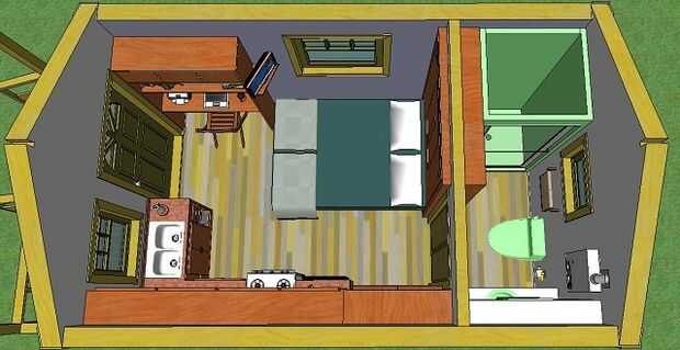 Cómo diseñar el interior depende de usted pero he aquí unas cuantas fotos para ideas. Os muestro la casa con paredes interiores de yeso y una pared de partición para incluir un cuarto de baño de 4'x 9'.