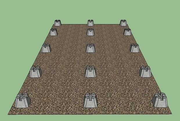 Imagen 1 es un sistema de bloque (Dekblock) cubierta no permanentes con bloques de cubierta de cemento colocados sobre una cama de 3 pulgadas o zanja de grava. Los bloques de la cubierta no deben ser más de 7 pies de separación. Suelo debajo de los bloques debe ser lleno y sólido. Las vigas del piso y marco de piso de caben directamente dentro de las ranuras del bloque de la cubierta. El marco de piso también debe ser anclado al suelo con suficiente huracán tirantes.