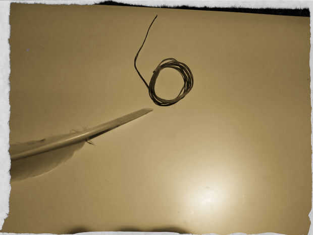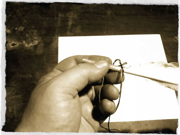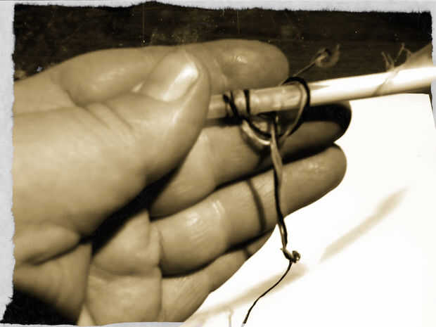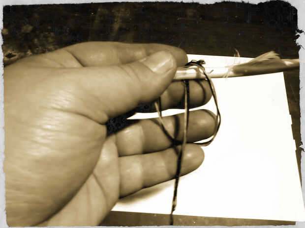Para el agarre yo uso ropa encerada y atar nudos medio enganche hasta el eje de la pluma de una pulgada o tan de la punta a donde empieza la pluma.
