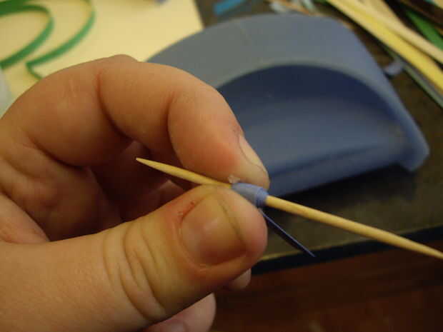 Comencé cortando mi papel en trozos de 3 pulgadas. Entonces había rizado previamente un número de ellos antes de comenzar. Esto es donde la gente que hace todo el tiempo de quilling podría estremecer! Aquí es cómo yo rizado mi papel-palillos redondos! Las herramientas quilling que se puede comprar son o una pieza de madera con un metal redondo mordió en la parte superior, o son un pedazo de madera con un metal redondo en la parte superior con una hendidura en el metal alrededor del pedacito del pedacito. Esto es donde usted Deslice su papel en y comience a girar la madera para obtener un buen enrollamiento apretado. Encontré que podía hacer lo mismo solo envuelve el papel alrededor del palillo. Me centré en girando el papel alrededor del palillo de dientes, en lugar de centrarse en girar el palillo de dientes. Parecía funcionar muy bien para mí.