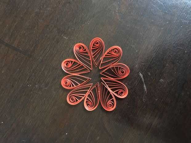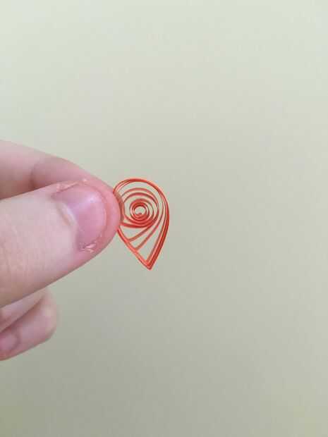 Para hacer las cuñas, cortar las tiras de naranja por la mitad. Utilice la herramienta quilling para hacer una bobina y luego dejar aflojar hasta cerca de 1/2 pulgada de diámetro. Adhiera al final y luego presione la bobina en forma de lágrima. Repita con las otras tiras de papel naranja.