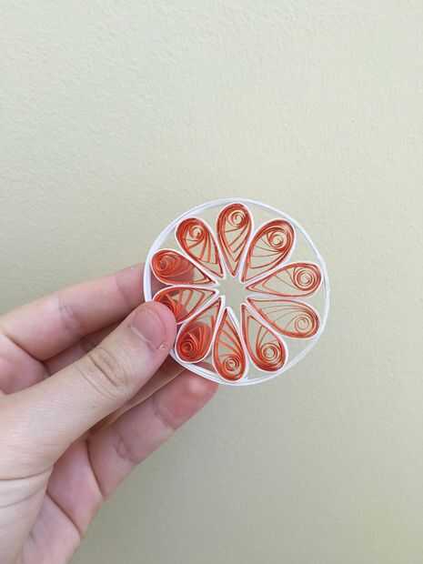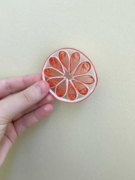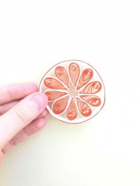 Unir dos tiras de papel blanco. Poner un poco de pegamento en la curva exterior de los gajos de naranja y comenzar a enrollar las tiras blancas alrededor de las cuñas. Adhiera al final. Repita este proceso con una tira o dos de papel naranja con la corteza.
