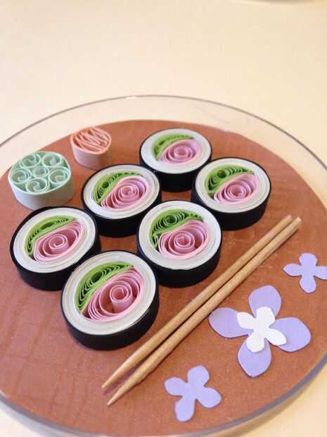 (Opcional: corte una punta de cada palillo de dientes.) Pegue los dos palillos al lado de tu sushi.