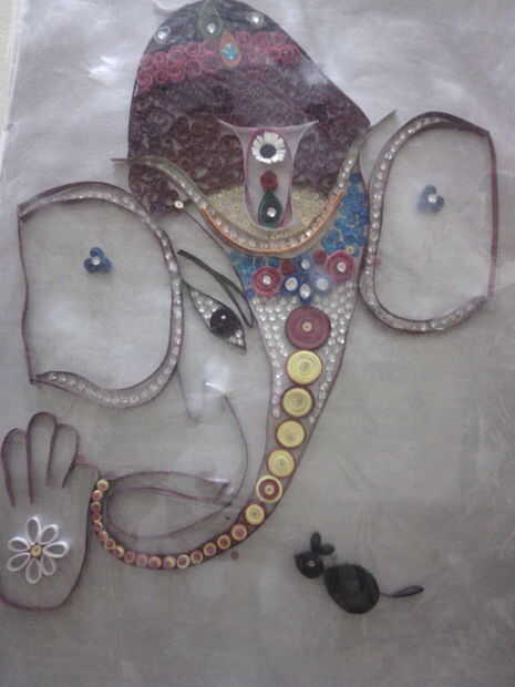 El señor Ganesha quilling arte comenzó con el bosquejo ligero y pegar las tiras de quilling en el plano más ligero. Y han hecho rata a través de las tiras wuilling. kundans pegado para el tronco y el ojo.