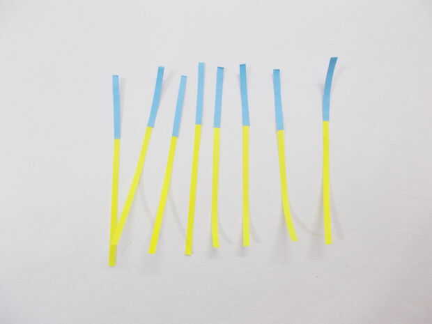 Dividir y cortar tiras de amarillas y azules en 4 partes iguales.