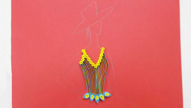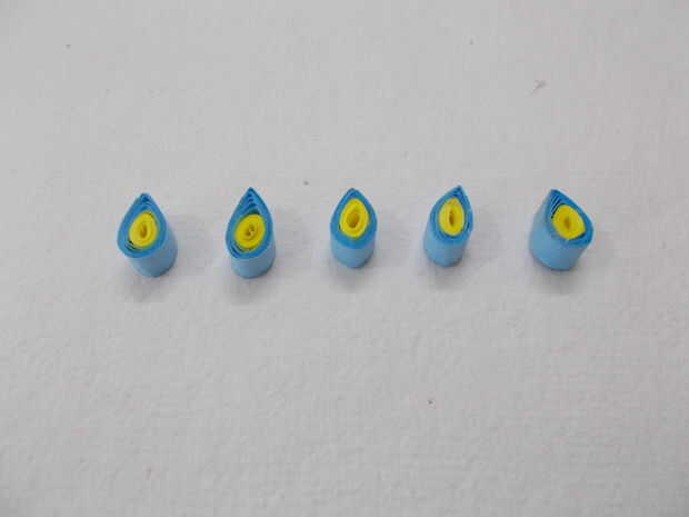 También pegar las tiras verticales de quilling, en el espacio entre las bobinas firmemente y la lágrima en forma de unos.