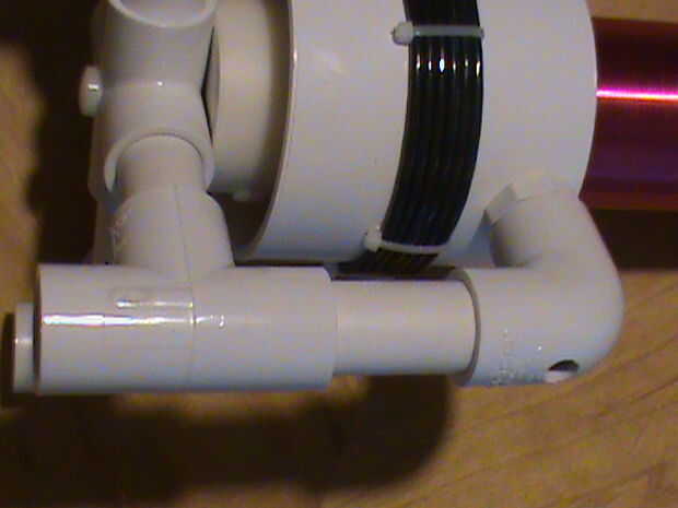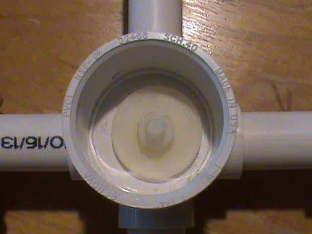 Perfore un agujero de 1/4 de pulgada en el centro de la clavija de 1/2. Ajuste el perno largo 1/4-20 nylon de 1 pulgada por el interior del acoplamiento de 3 pulgadas y en el enchufe de 1/2 pulgada. Coloque la tuerca de nylon en el perno (complicado, que esto lo pone dentro del enchufe!) y apriete. Esto une el enchufe hasta el borde superior del acoplamiento. Mermelada de la clavija de 1/2 pulgada en el extremo abierto del codo que se sienta encima de la articulación de T. El acoplamiento debe ser coaxial con la forma secundaria, es decir, centrado en él. Si es necesario, recorte el tubo donde la articulación T se adhiere a la Unión de X hasta que el acoplamiento esté centrado.