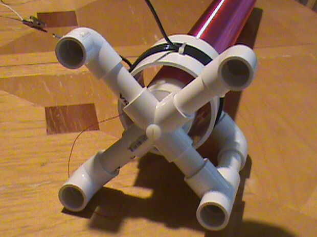 El marco es una versión simplificada del en mi Tesla candelabro Instructable. Comience con el conjunto de X. Perfore un agujero de 1/4 de pulgada a través del centro de la X, a través de todo el camino al otro lado. Empalme PVC muchos tienen protuberancias o partes planas, donde se llenó la pieza en el molde. Estas protuberancias son a menudo en el centro exacto de la X y ayudar a que sea fácil encontrar el centro.