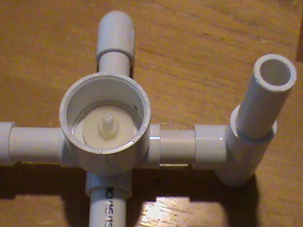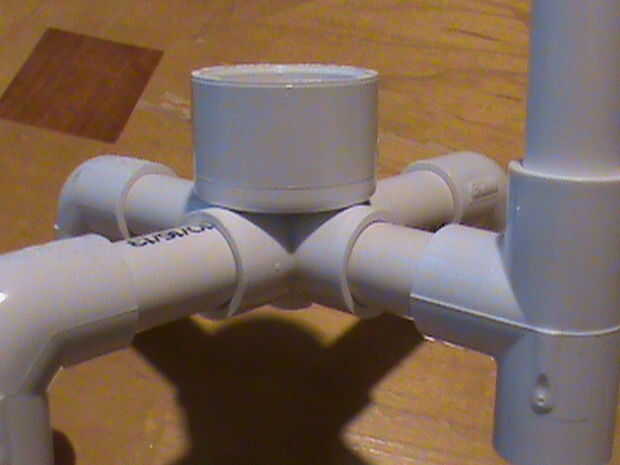 A continuación corta cuatro pedazos de tubería de 1/2 pulgadas PVC, cada uno de aproximadamente 2 1/2 pulgadas de largo. La longitud exacta no es crítica, pero es importante que todos sean la misma longitud. Colocar un trozo de tubería en cada abertura de la articulación de X. En tres pedazos de tubo colocar un codo de 90 grados. Gire los codos de manera que al aire libre termina boca abajo, creando 'pies' para el marco de soporte. En la cuarta pieza de empuje de la tubería en un conjunto de T, para que uno los puntos de extremo abierto, mientras que el otro extremo abierto forma el cuarto 'pie'. Ver las fotos para entender cómo todo esto va junto.