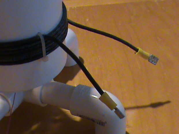 Deslice el secundario encima de la tapa de tubo atornillada al marco. Una buena fricción forma está bien, o se puede conectar el secundario con tornillos de nylon corta. No usar ningún metal. Ajuste primario sobre el secundario y empuje en lugar de la corta longitud del tubo conectado al extremo superior de la articulación T. Centro de primaria en la secundaria. Deje el secundario de tierra sendero (el cable de la parte inferior), preferiblemente lo más lejos posible de los conductores primarios. Suavemente estire alambre superior de la secundaria. La bobina está acabada. Tiempo para hacer la placa de circuito.
