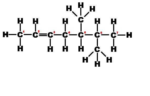 En este ejemplo el doble enlace está en el segundo carbono y hay 7 átomos de carbono en la cadena madre, por tanto, se llamará el final; "Hept-2-eno"