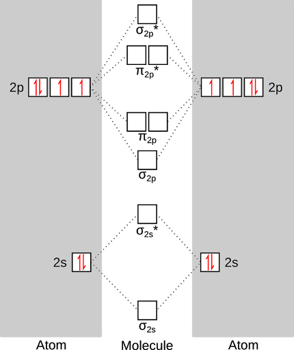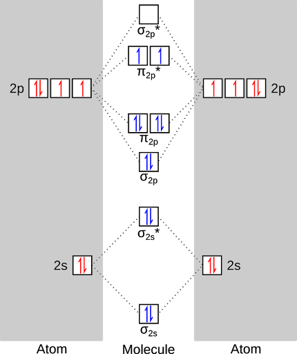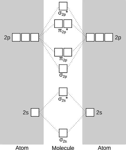 Primero, algunos términos y definiciones. El diagrama siguiente es un Diagrama de orbital molecular para el oxígeno. Esto es una forma de representar gráficamente los niveles de energía (orbitales) disponibles para los electrones llenar en una molécula. Las cajas a la izquierda y la derecha representan los orbitales atómicos que cada átomo de oxígeno contribuye a la molécula. Está etiquetado como s (con forma de una esfera) y p (en forma de un cacahuete). En el centro están los orbitales moleculares que se forman cuando los orbitales atómicos interactúan entre sí. Están rotuladas σ (sigma, en forma de una salchicha) y π (pi, en forma de, bueno, dos π pegado-al-pies). el show de asteriscos que son orbitales "antibonding" - son justo lo que suenan como y efectivamente "anular" un bono. Hay reglas para qué orbitales atómicos pueden "mezclar" y que no se puede pero eso lo dejaré para otro día.