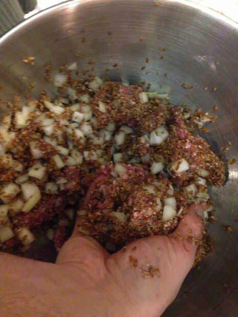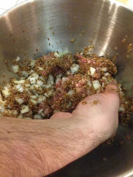 Lavar y escurrir bien el trigo bulgur. Mezclar el Trigo burgol con cordero, cebolla, sal y pimienta y amasar a mano hasta que se mezcle bien.